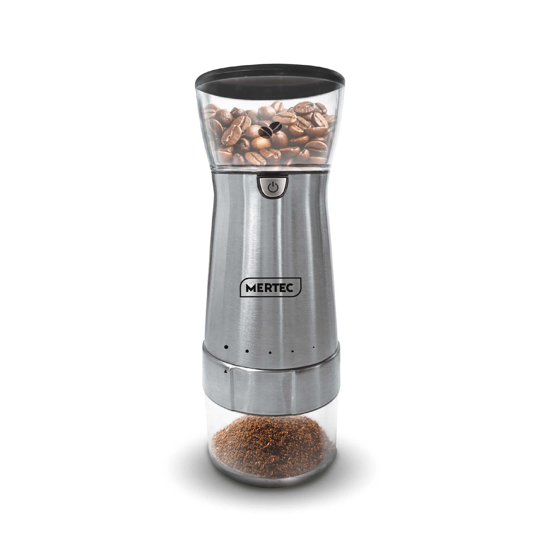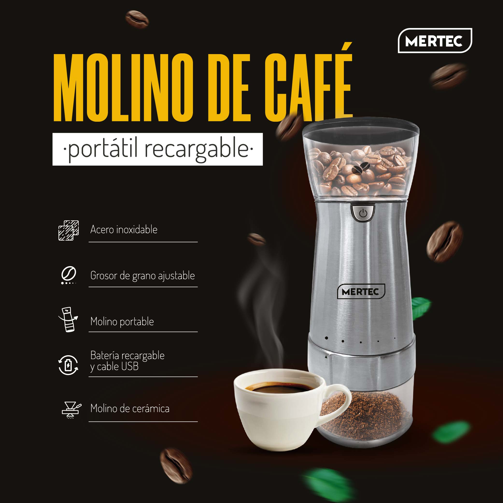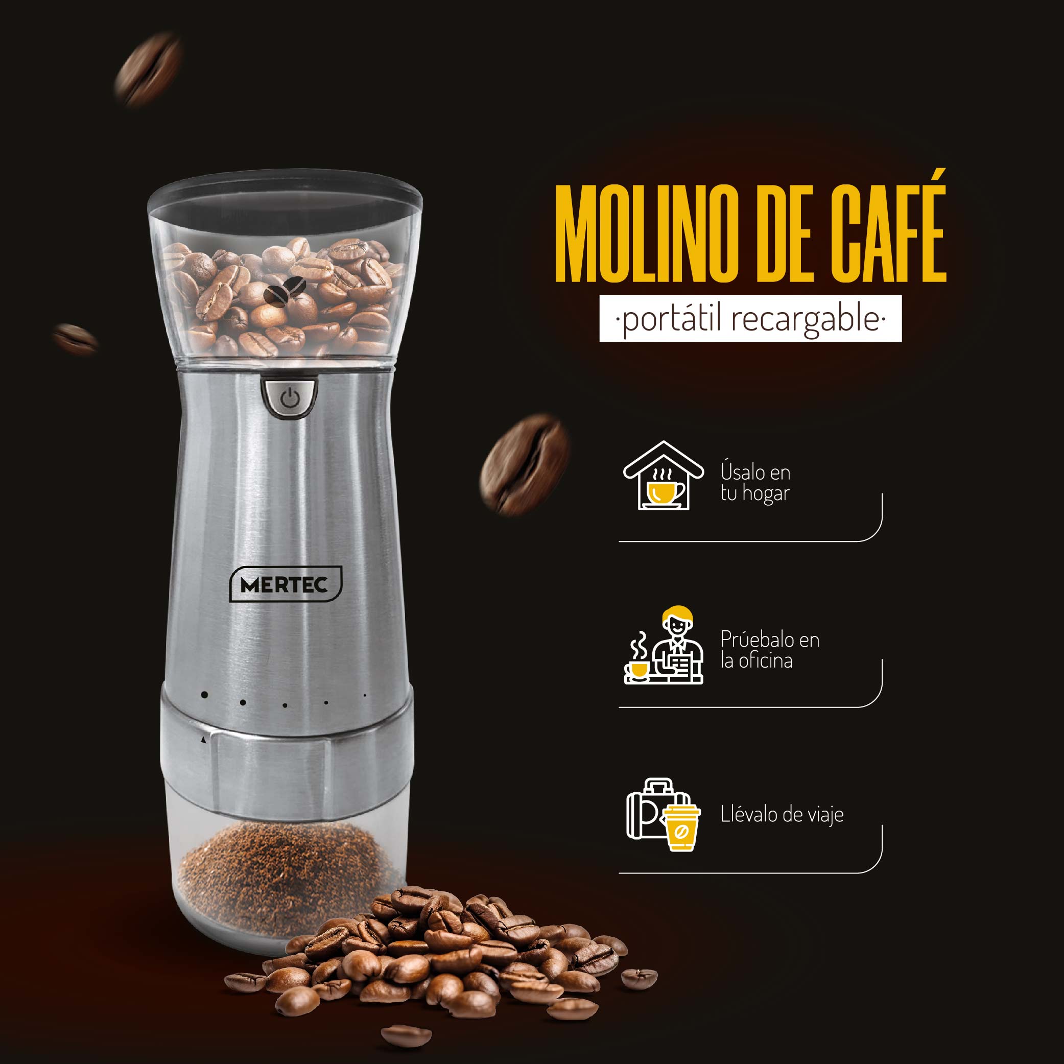 El Molino de Café Mertec MT-034S plateado es un modelo eléctrico ideal para moler café en casa de manera rápida eficiente, ajustable el grosor del grano, batería recargable con cable USB.