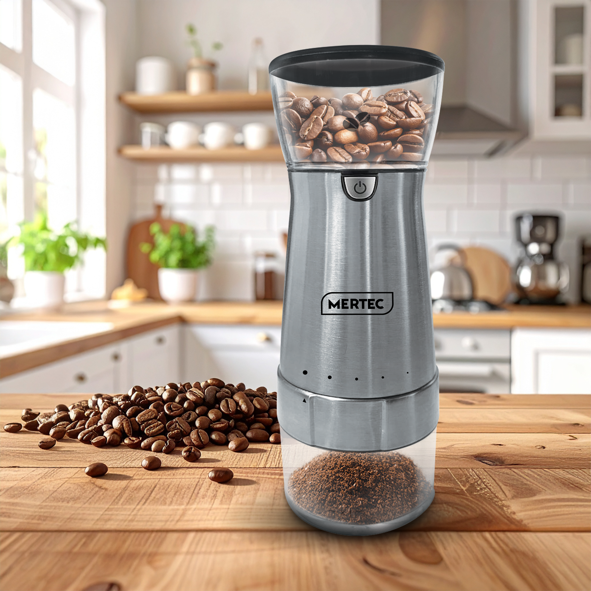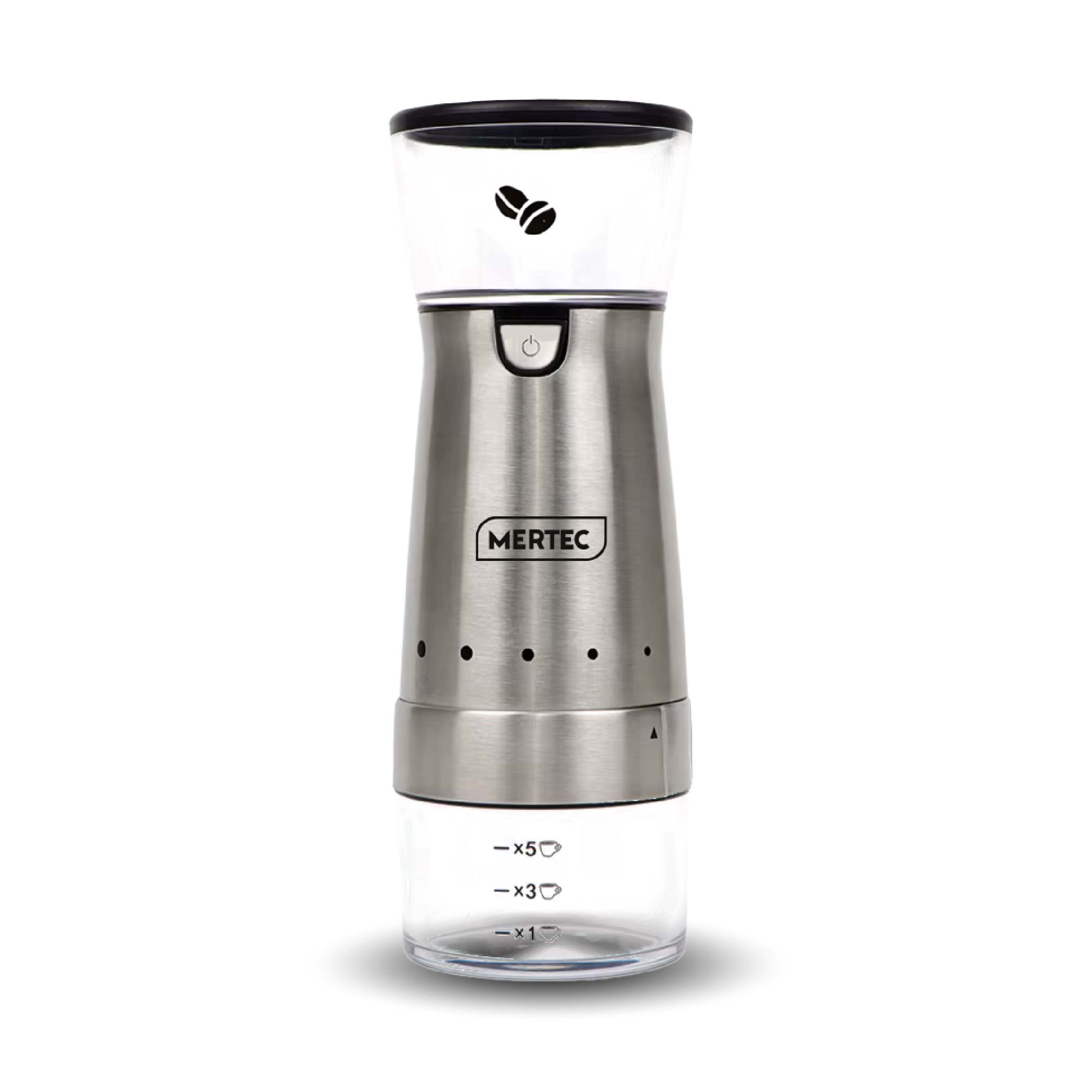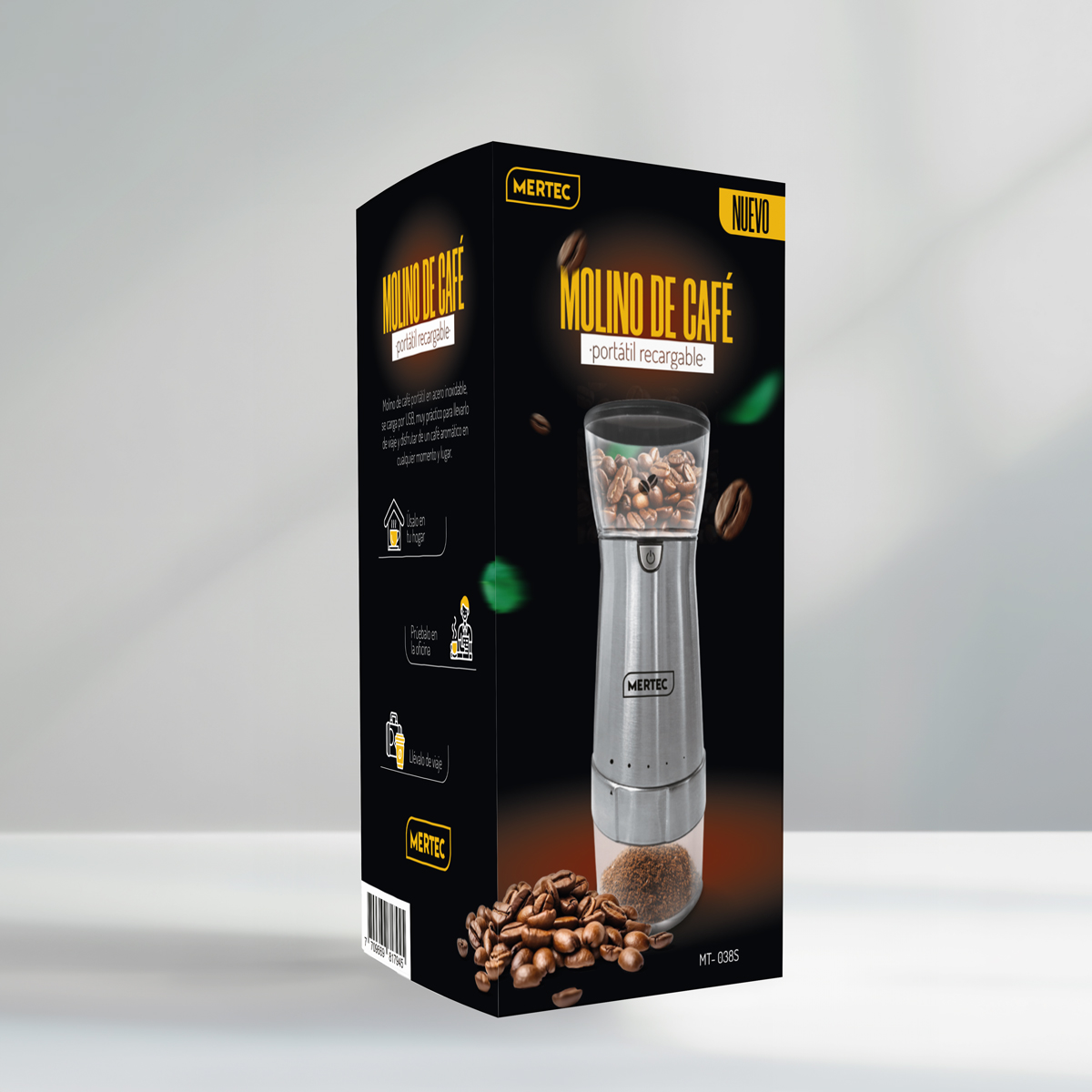 El Molino de Café Mertec MT-034S plateado es un modelo eléctrico ideal para moler café en casa de manera rápida eficiente, ajustable el grosor del grano, batería recargable con cable USB.